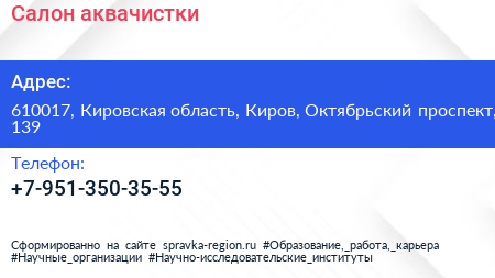 Салон аквачистки по адресу 610017, Кировская область, Киров, Октябрьский проспект, 139 в дальнейшем Организация, размещена в следующих категориях:
