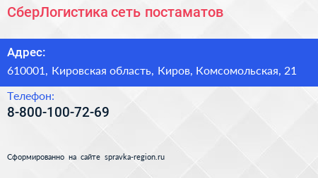 СберЛогистика, сеть постаматов по адресу 610001, Кировская область, Киров, Комсомольская, 21 в дальнейшем Организация, размещена в следующих категориях: