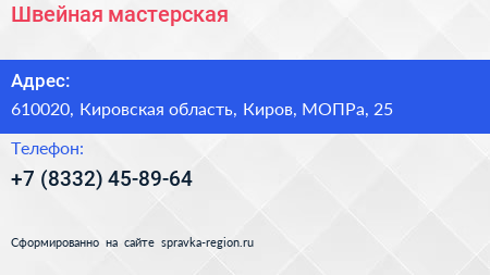 Швейная мастерская по адресу 610020, Кировская область, Киров, МОПРа, 25 в дальнейшем Организация, размещена в следующих категориях: