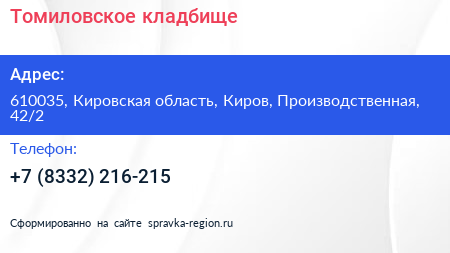 Томиловское кладбище по адресу 610035, Кировская область, Киров, Производственная, 42/2 в дальнейшем Организация, размещена в следующих категориях: