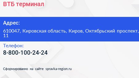 ВТБ, терминал по адресу 610047, Кировская область, Киров, Октябрьский проспект, 11 в дальнейшем Организация, размещена в следующих категориях: