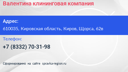 Валентина, клининговая компания по адресу 610035, Кировская область, Киров, Щорса, 62в в дальнейшем Организация, размещена в следующих категориях: