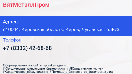 ВятМеталлПром по адресу 610044, Кировская область, Киров, Луганская, 55Б/3 в дальнейшем Организация, размещена в следующих категориях: