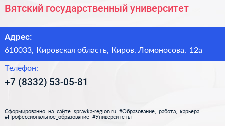 Вятский государственный университет по адресу 610033, Кировская область, Киров, Ломоносова, 12а в дальнейшем Организация, размещена в следующих категориях: