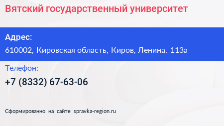 Вятский государственный университет по адресу 610002, Кировская область, Киров, Ленина, 113а в дальнейшем Организация, размещена в следующих категориях: