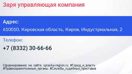 Заря, управляющая компания по адресу 610010, Кировская область, Киров, Индустриальная, 2 в дальнейшем Организация, размещена в следующих категориях: