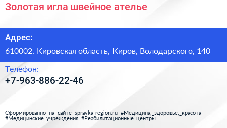 Золотая игла, швейное ателье по адресу 610002, Кировская область, Киров, Володарского, 140 в дальнейшем Организация, размещена в следующих категориях: