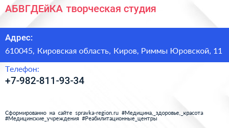 АБВГДЕйКА, творческая студия по адресу 610045, Кировская область, Киров, Риммы Юровской, 11 в дальнейшем Организация, размещена в следующих категориях: