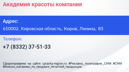 Академия красоты, компания по адресу 610002, Кировская область, Киров, Ленина, 83 в дальнейшем Организация, размещена в следующих категориях: