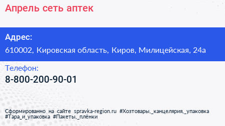 Апрель, сеть аптек по адресу 610002, Кировская область, Киров, Милицейская, 24а в дальнейшем Организация, размещена в следующих категориях:
