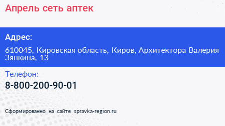 Апрель, сеть аптек по адресу 610045, Кировская область, Киров, Архитектора Валерия Зянкина, 13 в дальнейшем Организация, размещена в следующих категориях:
