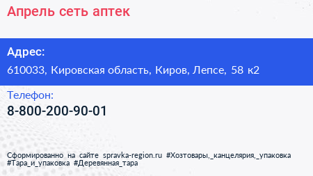 Апрель, сеть аптек по адресу 610033, Кировская область, Киров, Лепсе, 58 к2 в дальнейшем Организация, размещена в следующих категориях: