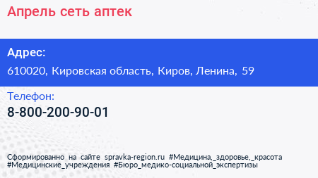Апрель, сеть аптек по адресу 610020, Кировская область, Киров, Ленина, 59 в дальнейшем Организация, размещена в следующих категориях: