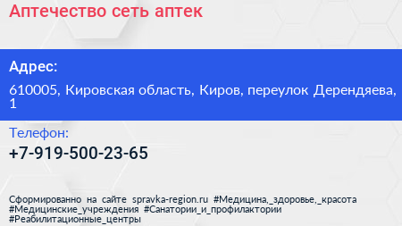 Аптечество, сеть аптек по адресу 610005, Кировская область, Киров, переулок Дерендяева, 1 в дальнейшем Организация, размещена в следующих категориях: