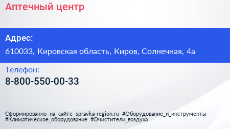 Аптечный центр по адресу 610033, Кировская область, Киров, Солнечная, 4а в дальнейшем Организация, размещена в следующих категориях: