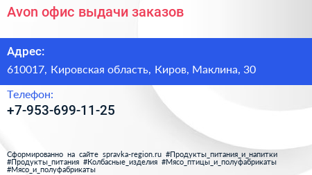Avon, офис выдачи заказов по адресу 610017, Кировская область, Киров, Маклина, 30 в дальнейшем Организация, размещена в следующих категориях: