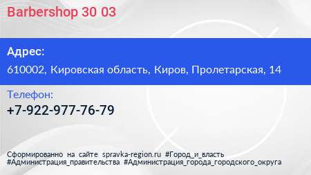 Barbershop 30.03 по адресу 610002, Кировская область, Киров, Пролетарская, 14 в дальнейшем Организация, размещена в следующих категориях:
