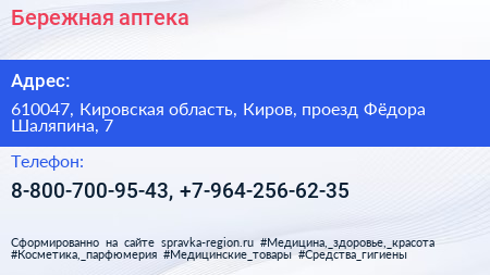 Бережная аптека по адресу 610047, Кировская область, Киров, проезд Фёдора Шаляпина, 7 в дальнейшем Организация, размещена в следующих категориях: