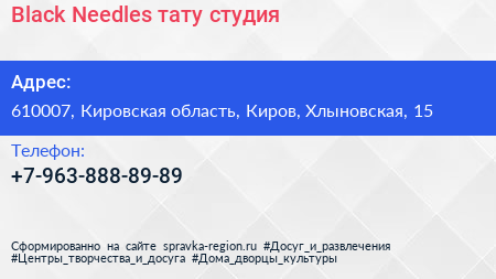 Black Needles, тату-студия по адресу 610007, Кировская область, Киров, Хлыновская, 15 в дальнейшем Организация, размещена в следующих категориях: