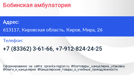 Бобинская амбулатория по адресу 613117, Кировская область, Киров, Мира, 26 в дальнейшем Организация, размещена в следующих категориях: