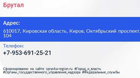 Брутал по адресу 610017, Кировская область, Киров, Октябрьский проспект, 104 в дальнейшем Организация, размещена в следующих категориях: