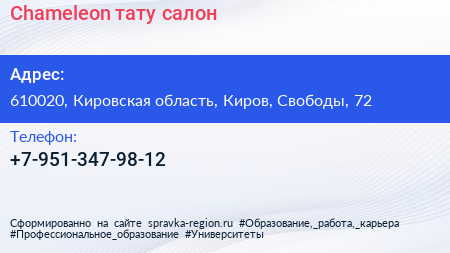 Chameleon, тату-салон по адресу 610020, Кировская область, Киров, Свободы, 72 в дальнейшем Организация, размещена в следующих категориях: