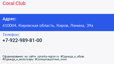 Coral Сlub по адресу 610004, Кировская область, Киров, Ленина, 39а в дальнейшем Организация, размещена в следующих категориях: