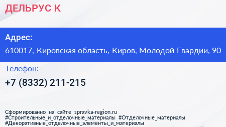 ДЕЛЬРУС-К по адресу 610017, Кировская область, Киров, Молодой Гвардии, 90 в дальнейшем Организация, размещена в следующих категориях: