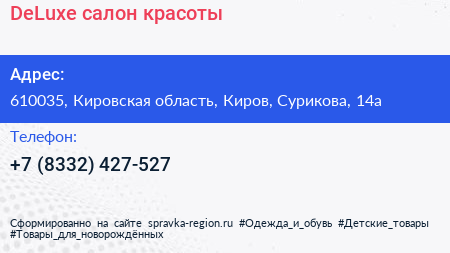 DeLuxe, салон красоты по адресу 610035, Кировская область, Киров, Сурикова, 14а в дальнейшем Организация, размещена в следующих категориях: