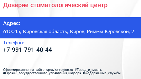 Доверие, стоматологический центр по адресу 610045, Кировская область, Киров, Риммы Юровской, 2 в дальнейшем Организация, размещена в следующих категориях: