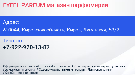 EYFEL PARFUM, магазин парфюмерии по адресу 610044, Кировская область, Киров, Луганская, 53/2 в дальнейшем Организация, размещена в следующих категориях: