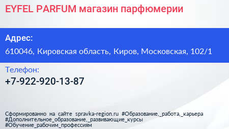 EYFEL PARFUM, магазин парфюмерии по адресу 610046, Кировская область, Киров, Московская, 102/1 в дальнейшем Организация, размещена в следующих категориях: