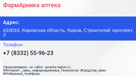 ФармАрника, аптека по адресу 610010, Кировская область, Киров, Строителей проспект, 2 в дальнейшем Организация, размещена в следующих категориях: