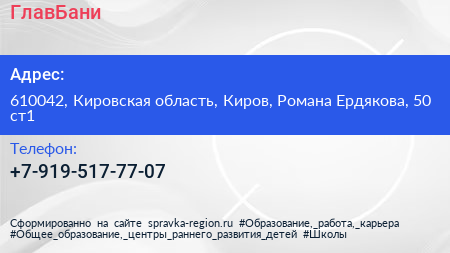 ГлавБани по адресу 610042, Кировская область, Киров, Романа Ердякова, 50 ст1 в дальнейшем Организация, размещена в следующих категориях: