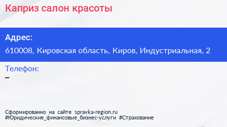 Каприз, салон красоты по адресу 610008, Кировская область, Киров, Индустриальная, 2 в дальнейшем Организация, размещена в следующих категориях: