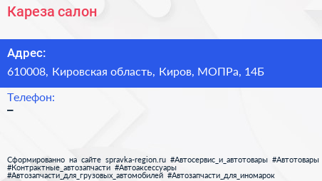 Кареза, салон по адресу 610008, Кировская область, Киров, МОПРа, 14Б в дальнейшем Организация, размещена в следующих категориях: