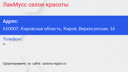 ЛакМусс, салон красоты по адресу 610007, Кировская область, Киров, Верхосунская, 16 в дальнейшем Организация, размещена в следующих категориях: