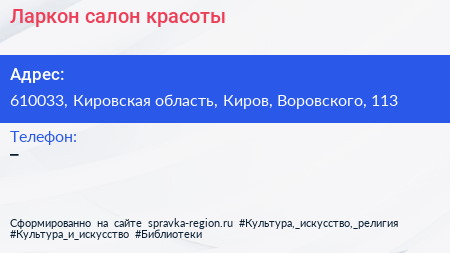 Ларкон, салон красоты по адресу 610033, Кировская область, Киров, Воровского, 113 в дальнейшем Организация, размещена в следующих категориях: