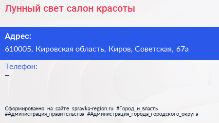 Лунный свет, салон красоты по адресу 610005, Кировская область, Киров, Советская, 67а в дальнейшем Организация, размещена в следующих категориях: