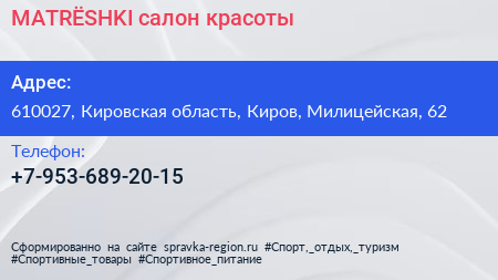 MATRЁSHKI, салон красоты по адресу 610027, Кировская область, Киров, Милицейская, 62 в дальнейшем Организация, размещена в следующих категориях: