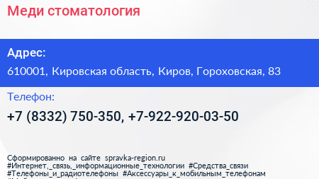 Меди, стоматология по адресу 610001, Кировская область, Киров, Гороховская, 83 в дальнейшем Организация, размещена в следующих категориях: