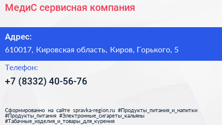 МедиС, сервисная компания по адресу 610017, Кировская область, Киров, Горького, 5 в дальнейшем Организация, размещена в следующих категориях: