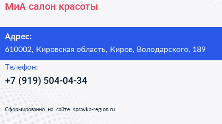 МиА, салон красоты по адресу 610002, Кировская область, Киров, Володарского, 189 в дальнейшем Организация, размещена в следующих категориях: