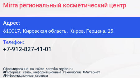 Mirra, региональный косметический центр по адресу 610017, Кировская область, Киров, Герцена, 25 в дальнейшем Организация, размещена в следующих категориях:
