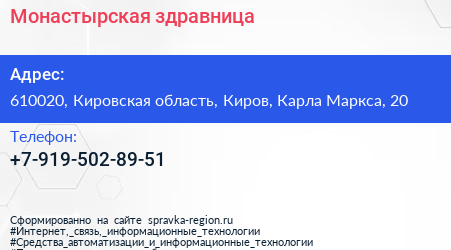 Монастырская здравница по адресу 610020, Кировская область, Киров, Карла Маркса, 20 в дальнейшем Организация, размещена в следующих категориях: