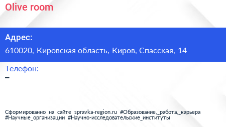 Olive room по адресу 610020, Кировская область, Киров, Спасская, 14 в дальнейшем Организация, размещена в следующих категориях: