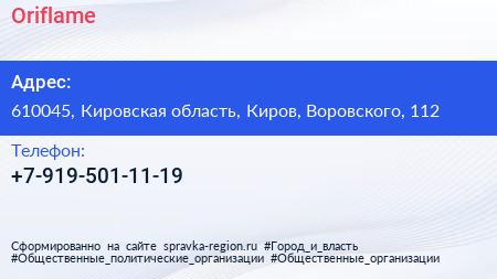 Oriflame по адресу 610045, Кировская область, Киров, Воровского, 112 в дальнейшем Организация, размещена в следующих категориях: