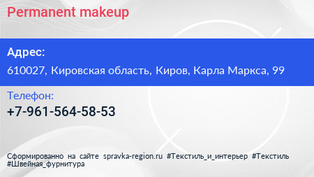 Permanent makeup по адресу 610027, Кировская область, Киров, Карла Маркса, 99 в дальнейшем Организация, размещена в следующих категориях: