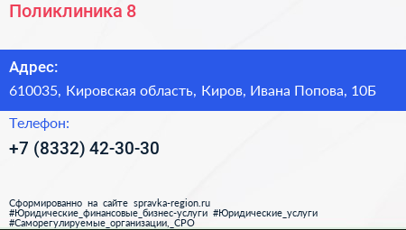 Поликлиника №8 по адресу 610035, Кировская область, Киров, Ивана Попова, 10Б в дальнейшем Организация, размещена в следующих категориях: