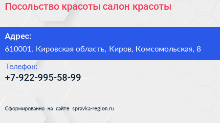 Посольство красоты, салон красоты по адресу 610001, Кировская область, Киров, Комсомольская, 8 в дальнейшем Организация, размещена в следующих категориях: